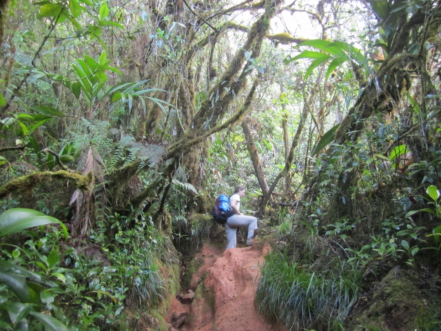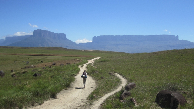 Anne hiking along an early section of the 22km approach trail. In the background are Kukenán-tepui to the left and Monte Roraima to the right. The origin of the name Roraima is unclear, but in one of the local indigenous dialects is believed to mean “the Great bluey-green one”, presumably a comment on the appearance of the tepui in this typical distant view.