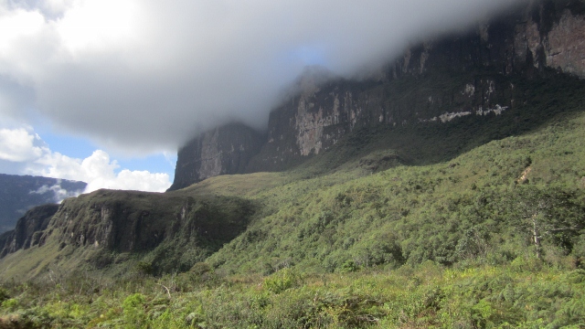 This northward view from base camp shows the forest that dominates the lower slopes of the monte, with its sheer 400m vertical face above and Kukenán-tepui behind on the left.