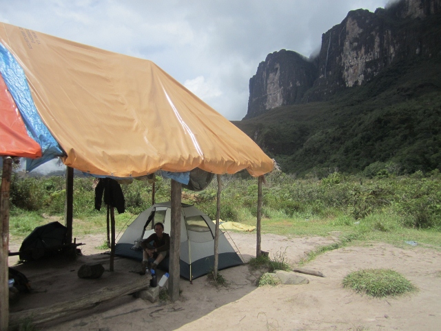 Anne emerging after an afternoon nap in our well-sheltered tent at Base Camp. Due to the volume of hikers now reaching Roraima (about 5000 per year) some semi-permanent structures have recently been built at Base Camp. Despite those numbers, all of the 150+ people we met on the trail were (or appeared to be) younger than us: it is definitely a climb for those of above average fitness and/or above average motivation!