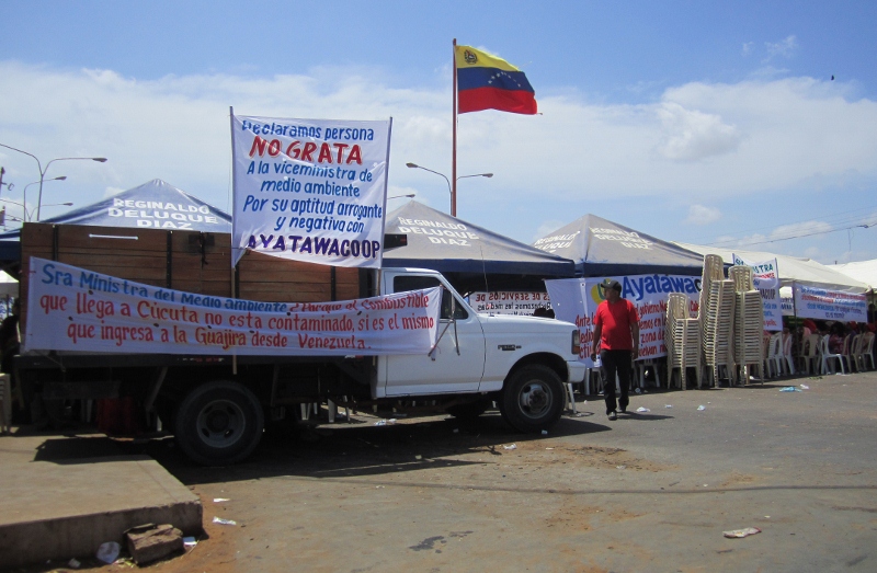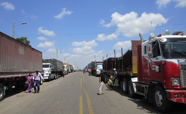 Finally we reluctantly made our way to the border with Colombia, right back where we started our South American circuit. Despite dire warnings from the handful of fellow travelers we knew who had spent time in Venezuela, we had had a remarkably trouble-free time in this great country. Predictably therefore, our 36th and final terrestrial border crossing was to be the most problematic. In general all of our crossings have been free of major challenges, and particularly in South America they have been very quick and easy. It all started after we had checked out of Venezuela at the immigration office and proceeded to drive toward the border, where the Venezuelan police assured us it was shut and could remain so for several days! We pulled to the side of the road and parked so Jon could walk up and get the story. It was in fact very much closed, not by government officials but by the hundreds of Colombian protesters physically blocking both sides of the roads. Above and below, the disheartening view that greeted us on arrival at the Venezuela-Colombia border.