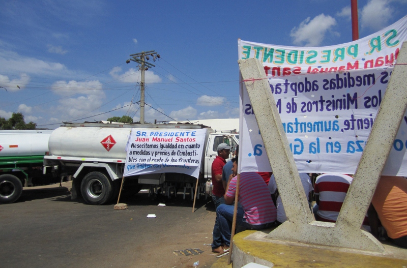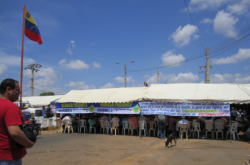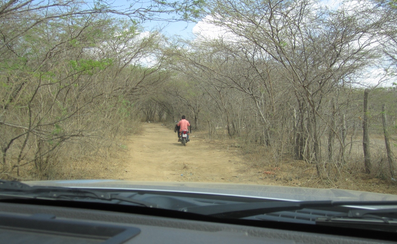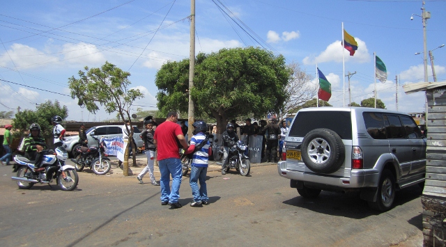Apparently the local indigenous group was protesting about the price and quality of fuel being sold to them by the government for distribution by their local cooperative. Word on the street was that they were waiting for the Environment Minister to arrive and if he didn’t come they planned to stay in place for at least five days! We were obviously a bit dismayed by the prospect of being stuck at the border, but we didn’t panic and figured we would just wait and see what happened. As we were standing around contemplating our options, Jon overheard some locals talking about a minor back track through the desert scrub that could be used to bypass the blockade and enter Colombia unofficially. Thinking fast, for the equivalent of a few dollars we hired a guy on a motorcycle taxi to show us the way (above). We encountered four informal “gates” along the route where enterprising locals had strung ropes across and were charging for passage, the price rising at each gate as we got closer to Colombia. But in the end we arrived safely and emerged in the Colombian side of town, right across the street from immigration and next to customs. None of the police officers that saw us come through seemed to care at all about our less-than-legal crossing but we were quick to make our way to the various offices to get ourselves and the truck officially checked in. Some officials were a little surprised to see us, but they avoided asking any awkward questions. In any case, the environment was relatively calm, as you can see by the contingent of fully armoured Colombian riot police ready if needed but staying cool in the shade of one of the few small trees (below). We even asked one of them to keep an eye on the truck while we got our paperwork done!