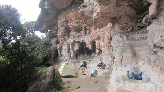 Our camp on top of Roraima for two nights at “Hotel Basilio”. About ten caves are euphemistically called “hotels”, offering a flatish surface for camping, and good wind, rain, and sun protection. Our little kitchen area in the foreground came complete with an active nest of Tepui Wren (endemic to the high tepui), with the adults constantly coming and going feeding large nestlings 7m up the cliff above our camp stove.