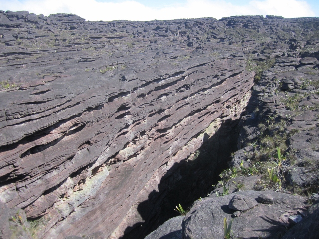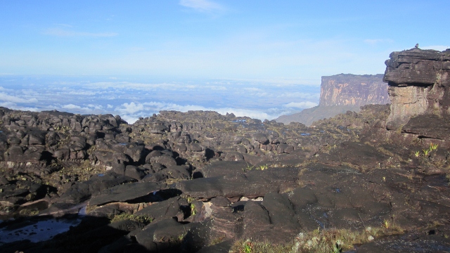 If you are lucky, as we were, and have fine weather, the views are spectacular in every direction. You frequently have the sensation that you are looking down from an aeroplane window! Above, the south face of Roraima-tepui, with La Gran Sabana stretching away into the distance. Below, the dawn view from our “hotel”, with Kukenan-tepui in the distance.
