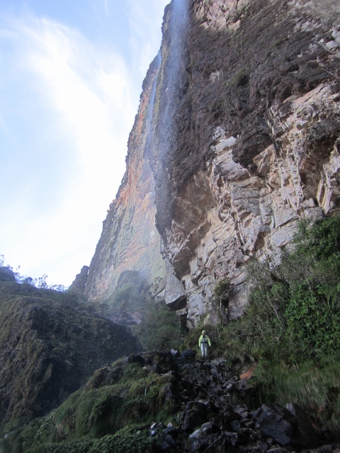 Overnight drizzle had augmented the many waterfalls coming off the tepui. After a couple of days on top, Anne descends in her waterproofs despite the lovely weather, as we had to pass under two active falls coming from the cliff face some 200m above.