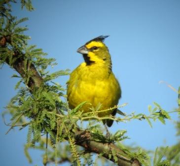 Yellow Cardinal (male left, female right), Reserva Nacional Ibera, 29th December 2011. Having been common and widespread in parts of Argentina, Uruguay, and southern Brasil several decades ago, the population of this beautiful species was estimated at fewer than 3000 birds in 2007. Its striking appearance, combined with a pleasant song, have made it a favourite in the cagebird trade, and populations have collapsed under relentless trapping. We failed to find it at well known sites where birders still saw it in the early 2000s, and have since heard that it has not been seen there recently, but we got lucky at Ibera where a small population persists. On its current trajectory, it seems likely that Yellow Cardinal will become extinct in the wild in our lifetimes.