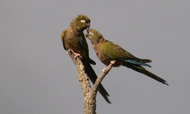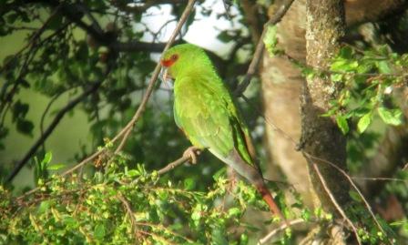 Slender-billed Parakeet has a long, thinupper mandible (upper side of the bill)adapted to feeding on Araucaria cones. Although forests within its range have been extensively removed, the species has been able to shift to feeding in tilled agricultural fields and appears not to have suffered serious population decline.
