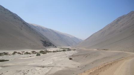 Stark but stunning Chaca Valley, northern Chile,in which Chilean Woodstar can be found. Natural vegetation is restricted to a narrow strip in the river channel, but we found the woodstar feeding on blossoms in a small citrus orchard on the (dry) river bank.