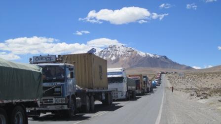 The extremely long line - stretching way around the visible corner and beyond - of Bolivian lorries waiting to enter Chile and make their way down to the seaports to pick up their load. Nearly all of Bolivia's shipped imports travel this route, the shortest from the coast to La Paz.