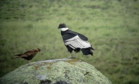 Even non-birding side trips produce birds. Although we had seen them in many places and five countries, Andean Condors were especially common in P. N. Los Glaciares. For reference the small bird to the left is an immature Southern Caracara, a raptor roughly the size (for North American readers) of a Red-tailed Hawk or (for British readers) a Common Buzzard. Incredibly when it later flew, we both thought we saw the condor shed a flight feather as part of its normal moult. Jon ran over to the spot and wehave become the proud owners of an amazing, curved, two-feet-long condor outer primary feather. The feather itself is bigger than most of the birds we have seen on these travels.