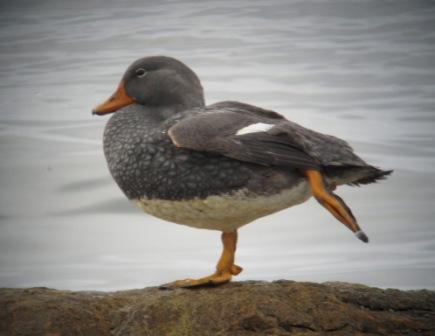 A Flightless (or Fuegian) Steamer Duck practicing some yoga, just south of Punta Arenas, Chile. Living in quiet bays in the chilly waters around and near Tierra del Fuego, they decided that flight was overrated, and that being big and chunky to survive the frigid conditions was probably more important (they are the size of a small goose). If they want to get anywhere in a hurry, which they rarely do, they can still use those vestigial wings for splashing their way across the water in the manner of an old style steam ship (hence the name).