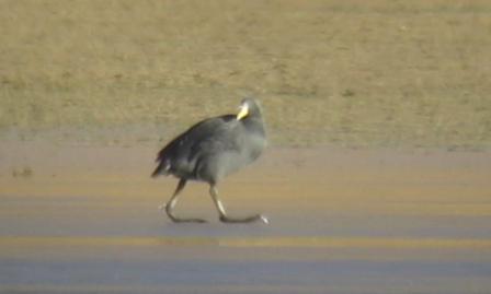 Horned Coot walking on ice on Lagunilla de Pozuelos. The distinctive black horn that hangs over the top of its bill and gives the coot it's name is barely visible in this poor photo. Note the oversize body and truly massive feet.