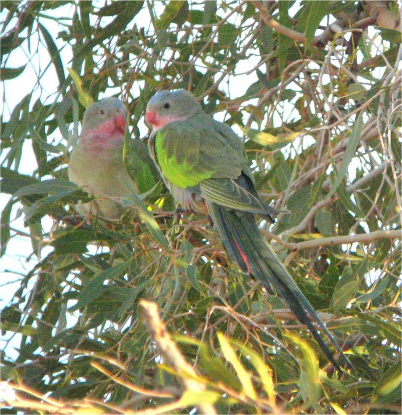 The bird highlight of the past few months goes hands-down to Princess Parrot, generally considered Australia’s best bird, combining rarity, remoteness, and beauty, and one of the World’s finest parrots. This species has not even been seen by the majority of serious Oz birders, and on our travels we have now found them on several occasions in three different places. This was the primary target of our entire Aus birding, and initially we had worked very hard to look for them. Despite having seen over half the World’s birds, our first sighting was undoubtedly a highlight of Jon’s birding career. Our sightings near Jupiter Well on the Gary Junction Road in the Gibson Desert (800km due W of Alice) actually sparked a bit of a twitch among Aussie birders, with at least three groups that we are aware of following up on our sightings, all successfully. We enjoyed our first successful trip to the Jupiter Well area so much we actually went back three weeks later, and found PPs again, and have just seen a few more in the Neale Junction area of the western Great Victoria Desert. The attached digiscope was taken by Jon near Jupiter Well on 26th June, the day we first saw Princess Parrots.
