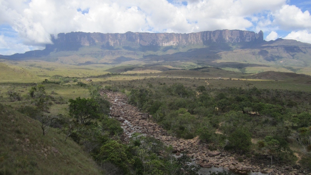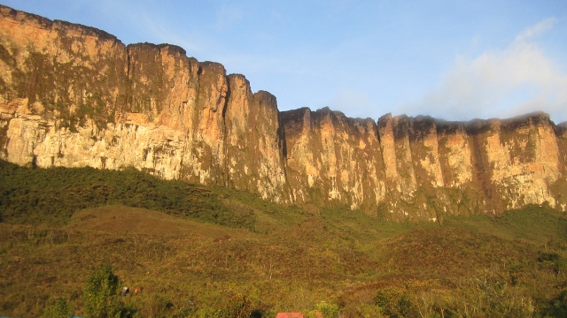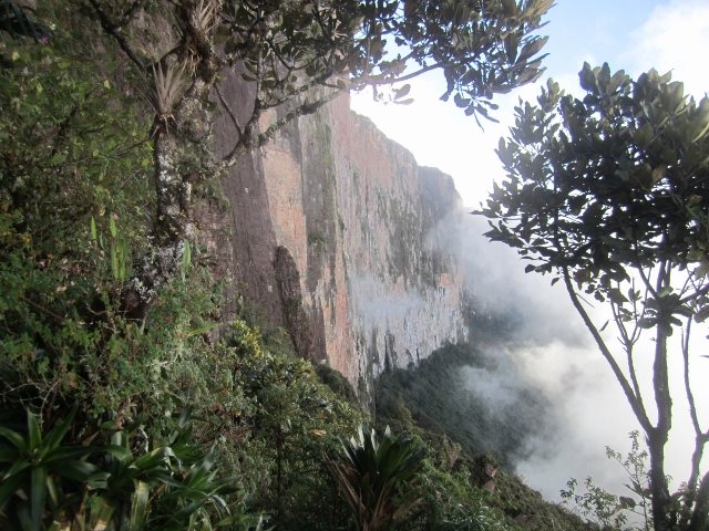 This northward view from base camp shows the forest that dominates the lower slopes of the monte, with its sheer 400m vertical face above and Kukenán-tepui behind on the left.
