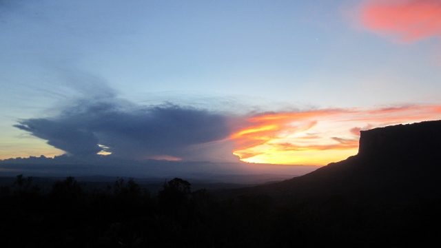 The views from base camp were spectacular in all directions, including this sunset storm over Amazonas to the west, with the southern end of Kukenán-tepui on the right.