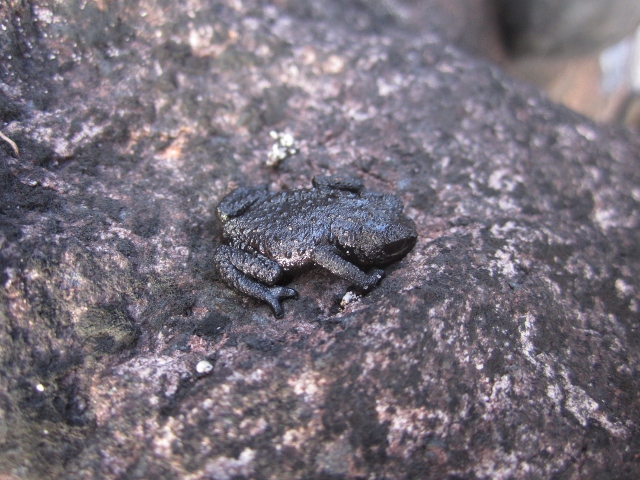 Oreophrynella quelchii, endemic to the top of Monte Roraima. This fully grown individual was only the size of a thumbnail. Oreophrynella is an ancestral frog genus endemic to the largest and highest tepuis, so well adapted to the exceptional environment that it has had little reason to evolve further. They cannot hop, but walk slowly. It is more closely related to African frog species than those in South America. High concentrations of melanin - blackish pigmentation - are common in many of the organisms found on the tepui, as an adaptation to resist the intense solar radiation, while providing camouflage among the blackish tepui rock.