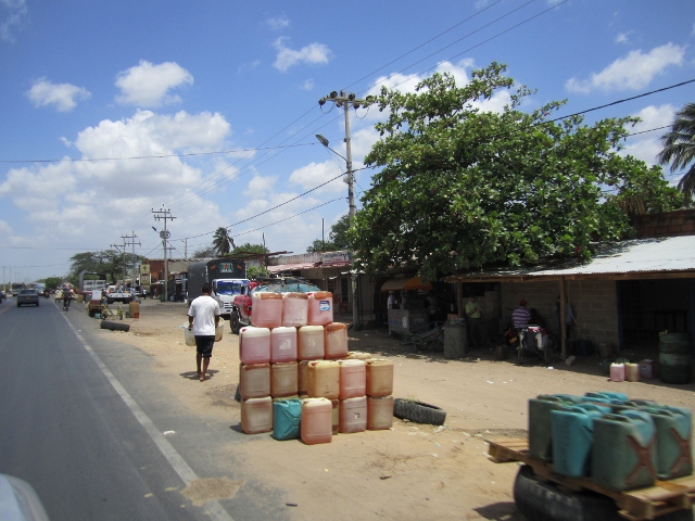 With paperwork in hand, we were finally ready to beat a hasty retreat. We were glad not be one of the dozens of frustrated truck drivers waiting to deliver their cargo across the border (above). As we drove away we were reminded of one of the many things we would miss about Venezuela – the cost of fuel. Despite efforts to control the passage of cheap Venezuelan fuel across the border, people still find a way to smuggle it - probably along the sort of back route we took - and it is readily available at the side of the road in Colombia (below). It is hardly surprising that such smuggling is rife: in almost three months in Venezuela we purchased 1049 litres (276 US gallons) of petrol at a total cost of 83.20 Bolivars (US$ 4.22). It costs more than that for a single gallon in Colombia.