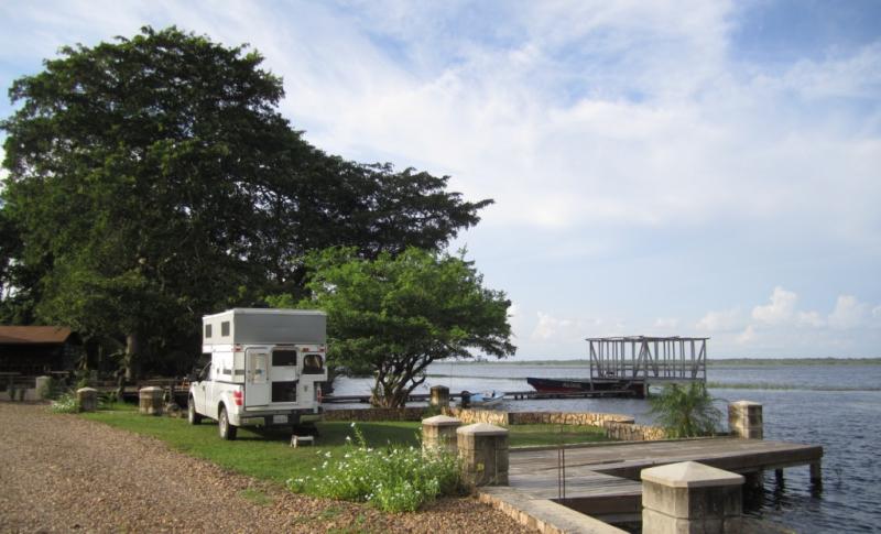 Our lovely campsite on the front lawn of the Crooked Tree Lodge, Crooked Tree, Belize, in early August 2010.