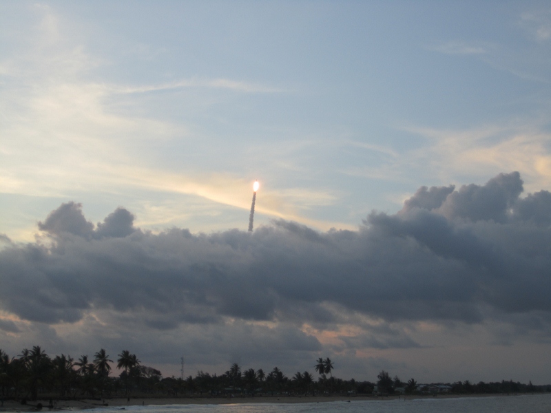 A huge part of the departement economy revolves around the Centre Spatial Guyanaise (CSG). There is a launch of the European Space Agency rocket, Ariane 5, a few times a year. One happened to be in late September, and we took a brief break from birding for more conventional tourism, going to Kourou to watch the launch. In addition to Vega, Ariane’s smaller cousin, the CSG is also a regular launch site for Soyouz rockets of the Russian space program. Being so close to the equator, the CSG takes advantage of the Earth’s rotation to allow launch of payloads 10% heavier than possible at Cape Canaveral. Of the three rocket types, Ariane is the largest, so we were lucky that this spectacular launch coincided with our time here. The rocket we saw was apparently carrying two telecommunications satellites. Friends recommended a lovely viewing spot on a palm-lined beach at Kourou some 10km from the launch pad. The launch was just after sunset, which made for a beautiful vista, and the rocket jettisoned its fuel boosters as it appeared to arc away over the near-full moon rising behind us. All very spectacular, and a uniquely Guyanaise experience.