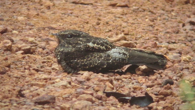 We were keen to have a quiet place to spend the Christmas holiday, so we returned to our favorite Guyane birding site accessible by road: the Piste de la Crique Dardanelles (Montagne de Fer in our previous post). We have visited this site three times for a total of nearly two weeks. It is an ideal situation for us, as we’ve been able to park and camp at various places along the 30-kilometre dirt track and it is great for birding because it is so lightly travelled. On our previous visit we remarkably had a Harpy Eagle fly across the road in front of us and perch in a tree less than 100 meters away, allowing us to watch it for over ten minutes! When we arrived over Christmas, we were initially frustrated to find a large tree had come down across the road about 12 kilometers in, as we were keen to spend several days at an excellent campsite we had previously found at the end of the road. Instead, we parked up just short of the treefall in the spot pictured above (the photo was taken on Christmas Day). But our disappointment quickly turned to appreciation as over the next few days birding along the road beyond the treefall we finally caught up with several key Guianan endemics we had failed to find in many weeks of birding in the Guianas – Blue-cheeked Parrot, Red-billed Woodcreeper, Black-throated Antshrike, and Glossy-backed Becard. At night we found that our camp was surrounded by a lek of very vocal and active Blackish Nightjars, one of which we relocated by day (below).