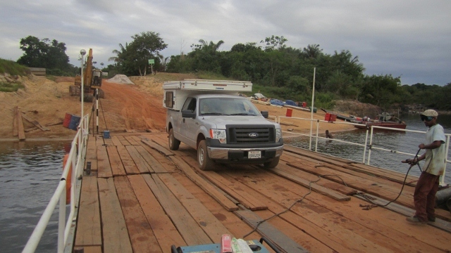 We reached the beautiful setting of the Essequibo River shortly before dusk, and we were the only vehicle on the last westbound trip the barge was taking that evening. Soni the garrulous welder, on the right of the photo, was still putting some finishing touches to patching the barge as we drive on.
