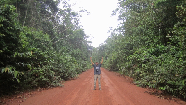 Jon celebrates our most fortuitous sighting of the entire journey (which has of course been full of very fortuitous sightings). As we were driving along the road south from the Essequibo crossing, he had spotted a fruitcrow fly across the road 100m in front of us. Assuming it would be a common species, but perhaps subconsciously thinking it looked different, we stopped to check it, found it perched (in the trees on the left side of this photo) and to our amazement saw that it was a stunning male Crimson Fruitcrow! One of the hardest endemic birds to see in the Guianas, the chances of finding one even in several days of solid birding in the forests of Guyana are slim, so the odds of seeing one while driving through the forest on our only day in this area were very close to (but evidently not quite actually) zero. Hence our excitement.