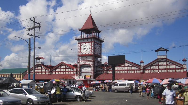 The riverfront Stabroek Market (above) dates back to 1792 and continues to be a bustling center of activity. The iron building and clock tower that now occupy the site were constructed by the British in 1880. It was intended to serve as the main railway station, but the accompanying rail system was never built. Prior to abolition, the market’s primary function was for unloading and sale of the many slaves brought to these shores.