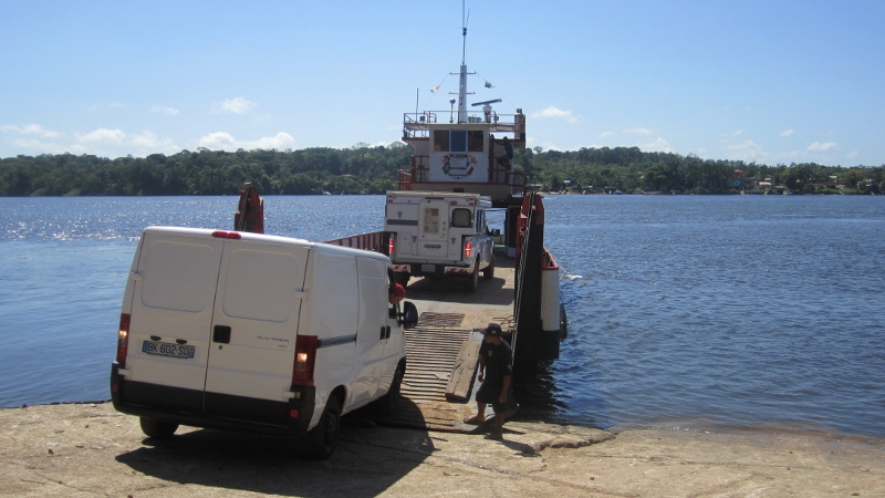 After seven months, we finally departed Brazil on 29th August. This lovely bridge spanning the Oyapoque River became the first road connection between any of the Guyanas and the rest of South America. Technically it connects the northern Brazilian state of Amapa with Europe, as French Guiana (Guyane, in French) is not an independent country but rather a departement of France and therefore part of Europe. Unfortunately, due to Brazilian indifference to the huge number of undocumented Brazilians entering Guyane, France and Brazil aren’t getting along too well these days, so despite being completed almost six months ago, the bridge has yet to open. The sleepy Brasilian town of Oyapoque from which we departed is visible in the distance. We had to cross the river the old-fashioned way, on a small barge. We are reversing off and into France below, with our friends Aurelie and Hyane (who we had first met in Belem) in their van ahead of us.