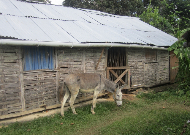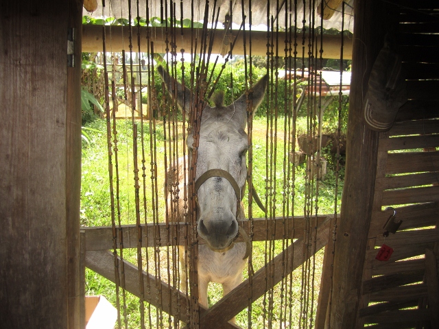 Back in the village, Unda kindly invited us over, and we spent our last couple of hours in Saul chatting over cups of green tea in her house. In a tiny village like Saul, and as Nimbus was the only donkey for hundreds of kilometres around, finding Unda’s residence was not a challenge as he brayed from the yard. Her house was very typical of the village, basically one big room. Nimbus is a very social donkey, and made various efforts to join the conversation as evident below. In a coincidence that defied belief, Unda had recently decided to leave a legacy to a donkey sanctuary that she had heard of in England, but had no means to arrange the details. As the first English person she had encountered in years, she asked Jon about this. Incredibly, and despite the UK being a country of 60 million people, Jon’s late aunt had volunteered at this very sanctuary, and upon our return to Cayenne we were happy to make the relevant contacts for Unda.