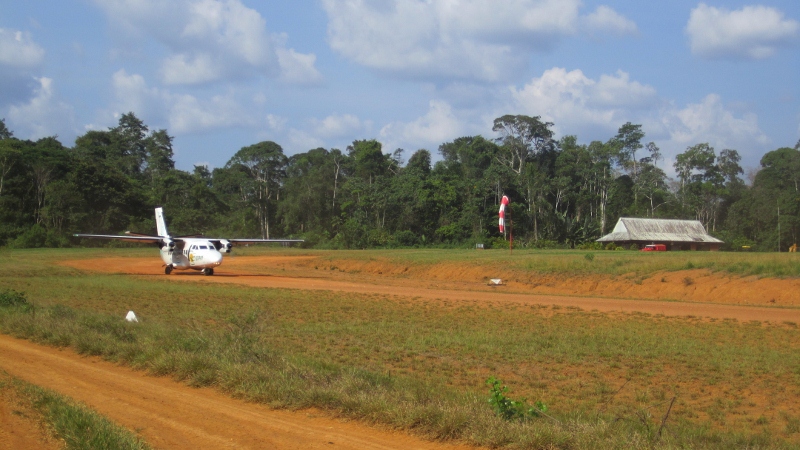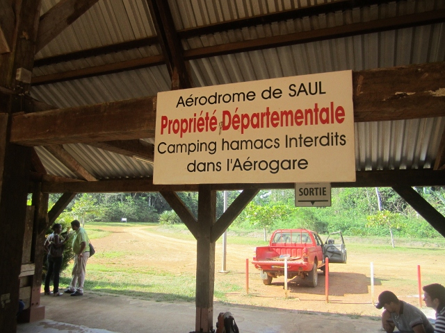 We have made several short birding trips away from Cayenne, but there are very few roads, so it is impossible to penetrate far inland except by boat or ‘plane. We decided to fly to the remote community of Saul, almost exactly in the middle of Guyane, and unusual for the Guyanas in that it is not on a river. It proved to be an incredible place, and we enjoyed eight wonderful days there, hiking 15+km every day and birding almost non-stop in the daylight hours. Not long after you leave the Cayenne airport, almost all sign of people evaporates and all you can see is forest to the horizon. The picture above is of the forest near Saul as we were coming down to land. The airstrip is literally cut into the forest. Below is the “airport” building with the afternoon flight readying for departure in the foreground.