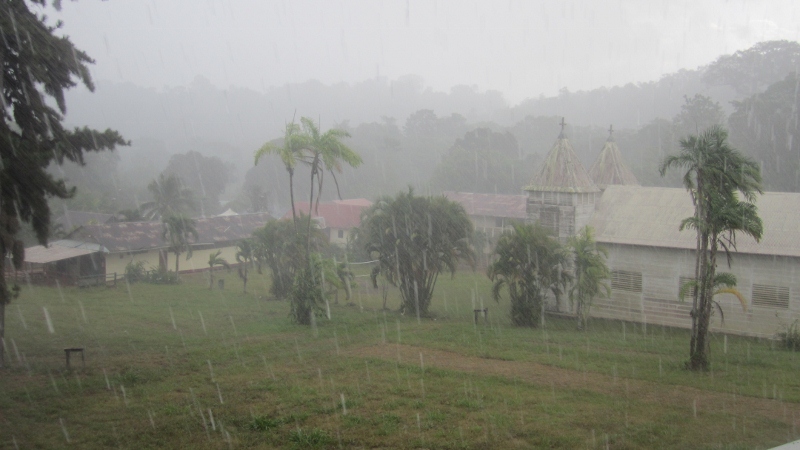 The view from the balcony of our room, during a thunderstorm (above) and five minutes later (below). We could see most of the village from here, and it proved to be an excellent birding vantage point too. Even in the heart of the “dry” season, we had brief but intensive tropical storms on half our evenings in Saul, but we were never rained on when birding.