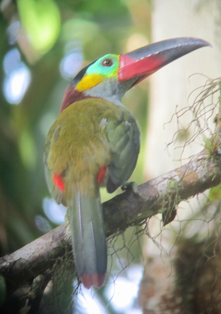 The birds and mammals were superb in the reserve, and having originally planned to stay a couple of days, we finally left six days later! Having had no hunting pressure since the lake was created, the density of animals was very high in this reserve. We had great observations of many good birds, Mountain Lion, and many monkeys including two excellent species of saki monkeys, one of which was the rare Brown-bearded Saki. Below is a female Guianan Toucanet, photographed in the tree next to our campsite. Although we had seen this species well in French Guiana also, this was typical of the quality of views of many species that we had at Brownsberg, most within a few hundred metres of our camp.