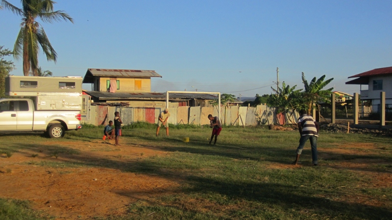 We had to stage at Nickerie, Suriname’s second largest town, as it is situated on the river that forms border with Guyana. At the suggestion of Pastor Jacobson, we stopped at a wonderful orphanage near the edge of town, the “Olga Clarck Kinderhuis”. The managers Giliano and Rachel were extremely welcoming, and let us camp on the orphanage lawn. The boys invited Jon to join their game of cricket in the evening (he is “wicket”-keeping in the image above). For a bat we used a small plank of wood, and the wicket was an upturned bucket. (On our return journey we stopped there again overnight, dropping off some proper kids cricket gear that we had bought in Guyana, among other things, for the orphanage.)