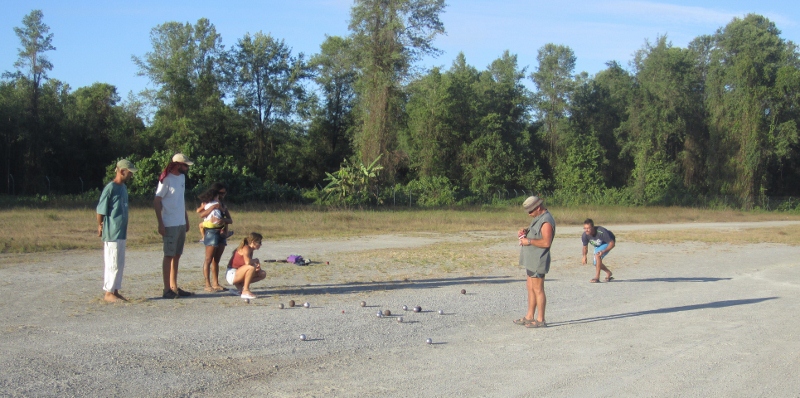 Every Sunday afternoon a group of folks from the resident and visiting sailboats plays the traditional French game of petanque (also known as boules) in the carpark. Jon has become a regular at the petanque matches on Sundays when we are at the marina. We never quite know who will show up from one week to the next, but a popular teaming has the Francophones (French & Swiss) versus the World (anyone else). It is great fun and easy going, although with plenty of trash talk in three or more languages! The World team has won for several weeks in a row, and we take much delight in pointing out that the French are losing at their own national game. From left to right, Laurent (French), Jon, Rosa (Brasilian, with baby Naomi), Claudia (French), Gary (Zimbabwean), and Laurent (Swiss, bowling). On this Sunday, Jon, Rosa, and Gary made up the winning World team.