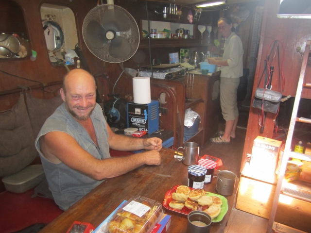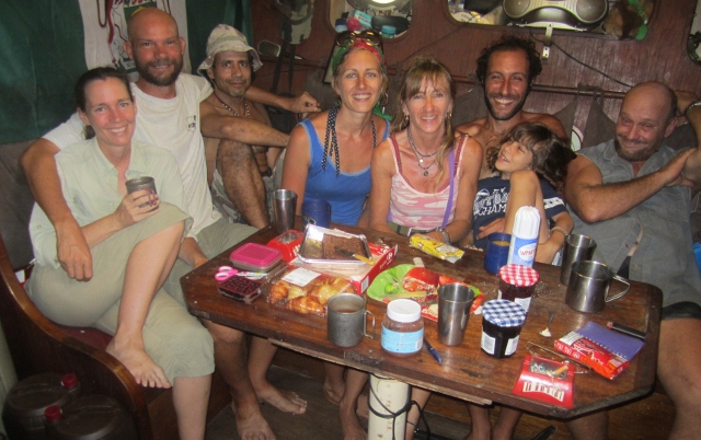 For our penultimate night at the marina at Degrad des Cannes, where we have been based for most of our time in Guyane, we had a "British Tea Party" to say farewell to some of our many friends there. Pictured above, Anne is baking scones in the galley aboard the Stella Maris, where our friends Gary and Angela kindly hosted the get-together. In the foreground, Gary is looking especially happy at the first plate of scones to emerge from their newly fitted oven! Part of post-scone wreckage below, from left to right: Anne (US), Jon (English), Edi (Spanish), Sara and Claudia (French), Arvin (Armenian Iranian) with Angelo (son of Edi and Claudia) on his lap, and Gary (Zimbabwean). The photo was taken by Angela (Welsh).