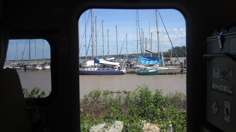 Jon’s view for ten continuous days from the back of our camper, while under strict instructions from Nurse Anne that he had to keep his recently-operated toe up on the couch. With (seemingly) free electricity, showers and water, plus a great community of fellow travelers, our spot at the Degrad des Cannes marina near Cayenne has been (by a huge margin) the single campsite we have spent the most time on our entire Latin American journey.