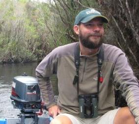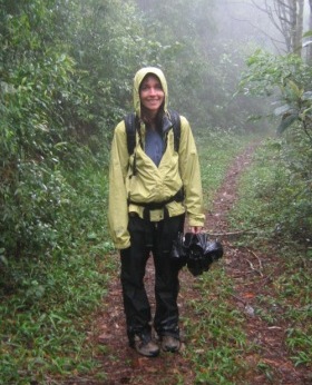 Anne getting a clear idea of why it is called rainforest while searching for the rare endemic birds of south-east Brazil, November 2006; Jon captaining the good ship "Polly" when we volunteered on the Orange-bellied Parrot recovery project at Birchs Inlet, SW Tasmania, Australia, November 2009.