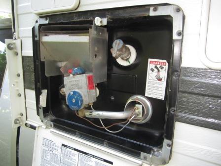 Hot water system a real luxury, heats using propane. The exterior panel containing the hot water ignition system is shown below.